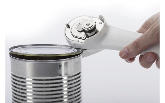 Praktischer Sicherheits-Dosenöffner zum Öffnen von runden und eckigen Konservendosen, Vorteil: Keine scharfen Kanten, Dosendeckel wieder aufsetzbar: Dose wird am Rand eingeschnitten.